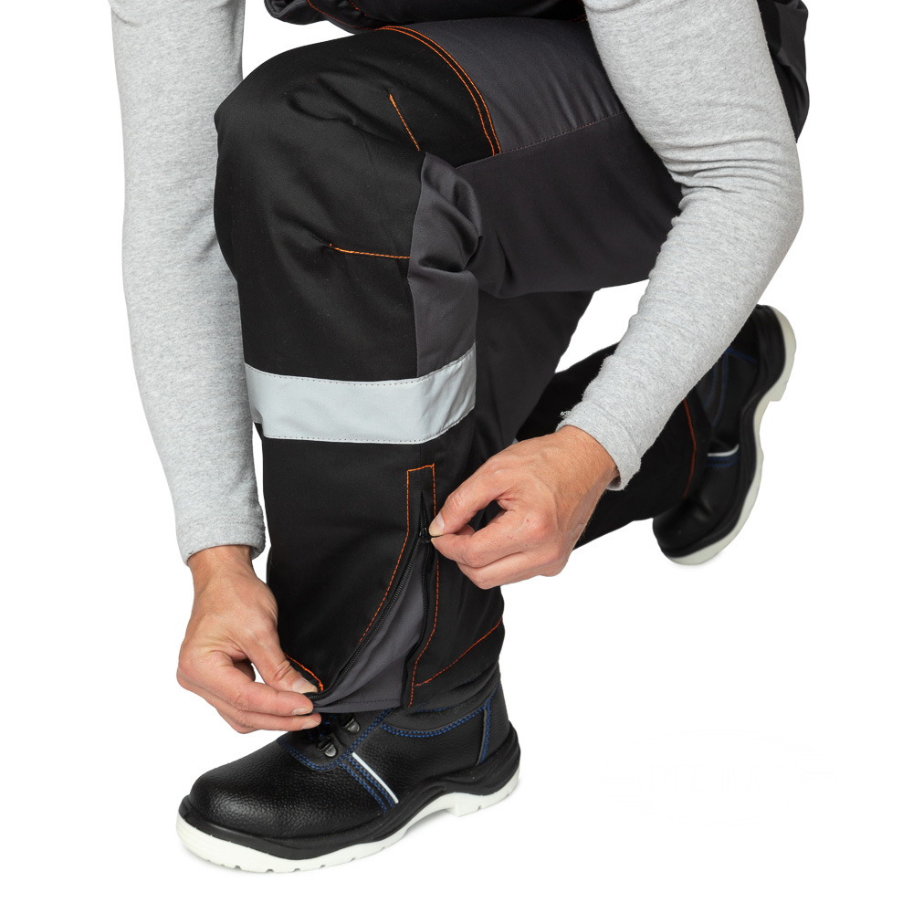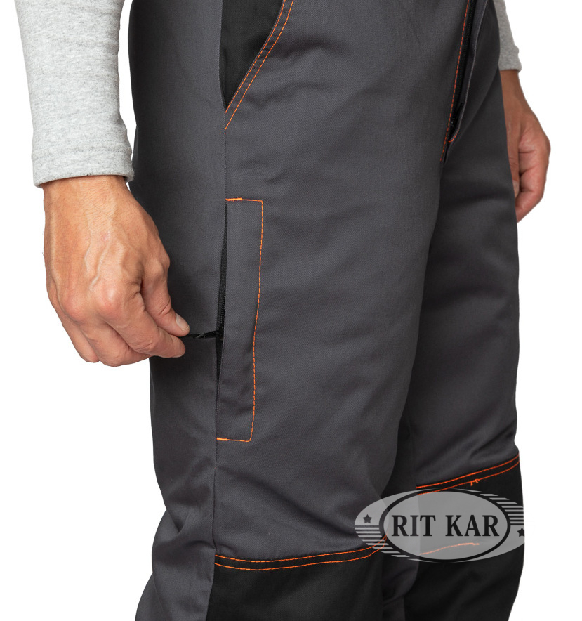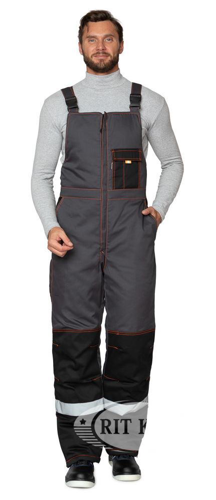 Полукомбинезон: прямого кроя, с застёжкой на двухзамковую молнию, закрытую притачной планкой. Бретели регулируются застёжками-фастексами. Плотность прилегания к талии регулируется поясом с резинкой. На коленях анатомические вытачки. По низу брючин в боковых швах расположены разрезы, застегивающиеся на молнию. Ширина разреза регулируется вставкой из основной ткани. Это позволяет удобно надевать и снимать обувь за счет возможности увеличить ширину нижней части брюк.