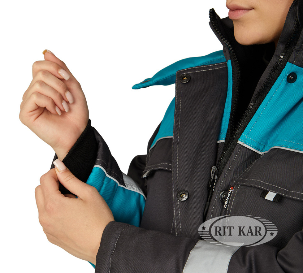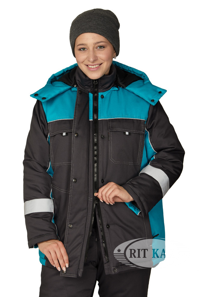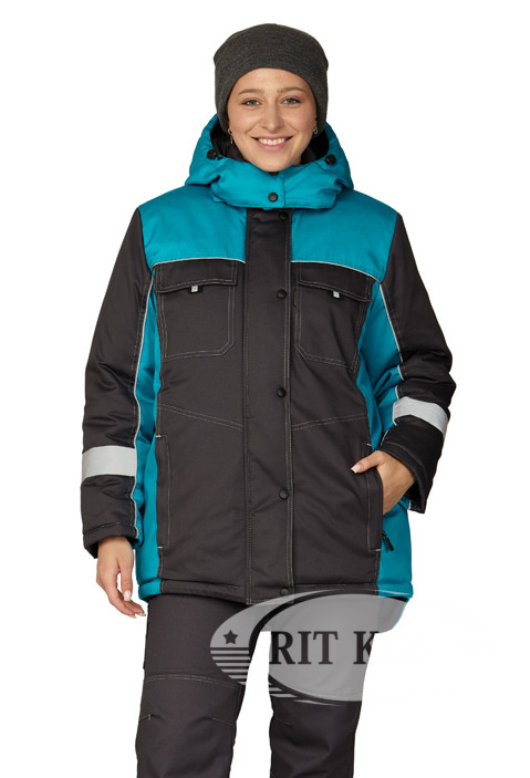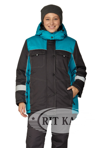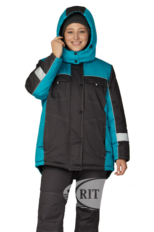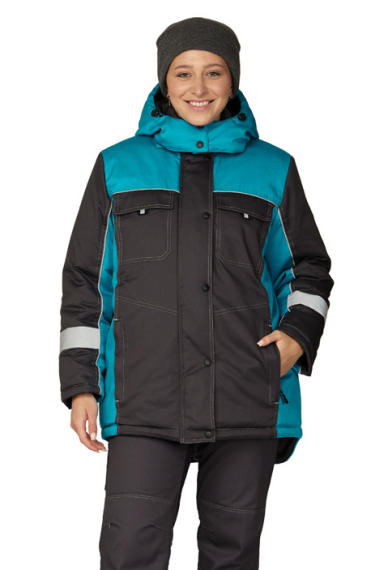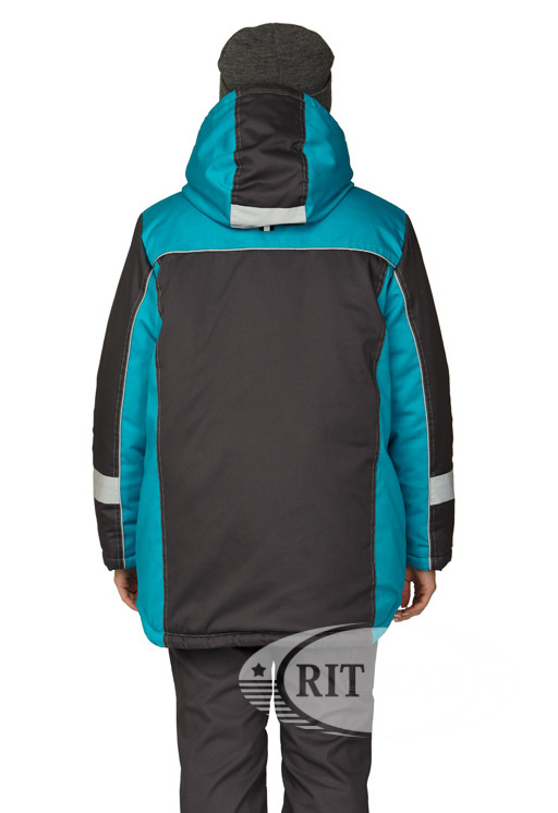 Куртка: прямого силуэта с удлинённой спинкой, с притачной теплозащитной подкладкой, с центральной застёжкой на двухзамковую молнию. Молния с обеих сторон защищена ветрозащитными планками: верхняя планка утепленная с застежной на пять кнопок, верхняя внутренняя часть планки из флиса. Центральная молния в зоне воротника защищена сверху планкой с отделкой флисом для защиты подбородка от травмирования, натирания молнией, а саму молнию защищает от поломки. Спинка с кокеткой и рельефами, удлинённая. На подкладке ветрозащитная юбка с застёжкой на кнопки. Рукава втачные, двухшовные, с внутренними трикотажными манжетами. Воротник-стойка.